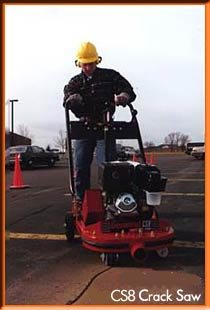 General's CS8 Series Random Crack Saw is designed to follow irregular crack patterns in asphalt and concrete surfaces. The unit utilizes 8 inch diameter, dry cut diamond blades in industry standard widths to produce smooth sided cuts to prepare surfaces for proper crack filling. Maximum straight line cutting depth is 1 - 1/2 inches. The center mounted blade configuration allows the CS8 to pivot about its own axis to more exactly follow random crack patterns. The extra control affords easier handling than crack saws with side mounted blades. With this unique configuration, extended blade life is realized by minimizing warpage potential. Direct line visibility to the operator helps keep productivity high. Power is supplied by a variety of industrial class gasoline engines. A propane conversion is also available for use in confined areas where normal exhaust fumes are not permissible. Other standard features include an infinitely adjustable blade height control with a quick release lever and a 3 inch diameter vacuum port for dust control. When wet cutting is preferred, an optional water mist control system is available. General's CS8 an ideal solution for surface preparation. CS8/GH Random Crack Saw, equipped with Honda GX340 Series 11 HP gasoline engine with oil alert and Cyclone type air filter.